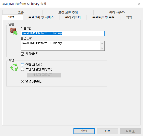 아래 작업 란을 보면 연결 차단으로 지정되어 있는 것을 볼 수 있다. 연결 허용으로 바꾸어 준 뒤 확인을 누른다.