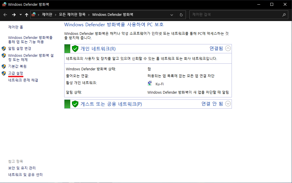 [제어판 → Window Defender → 고급 설정] 으로 들어간다. 제어판은 시작을 누른 뒤 바로 "control"을 입력하거나 실행에서 "control"을 입력하면 들어갈 수 있다.