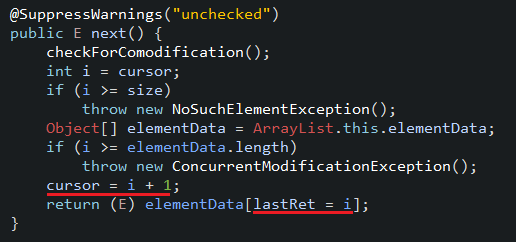 next 메서드는 다음 값을 반환하는 메서드다. cursor를 i에 복사한 후 1 증가시키는 것으로 cursor는 다음 위치를 가리키도록 한다. cursor의 이전 값이 저장되어 있는 변수 i로 elementData를 참조하는 동시에 lastRet에 i를 저장한다. 이 메서드가 종료되었을 때 cursor는 다음 참조할 위치, lastRet은 이전에 참조한 위치를 가리키고 있게 되는 것이다.