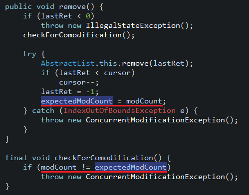 위의 두 변수가 반환할 다음 값을 찾고, 삭제하는 역할을 했다면 이 변수는 에러를 확인하는 역할을 한다. 이 변수는 객체화될 때 modCount라는 변수의 값으로 초기화되는데, modCount는 ArrayList의 슈퍼 클래스인 AbstractList(추상화 클래스)에서 상속받은 변수다. ArrayList에서 특정 메서드가 수행될 때마다 modCount의 값이 1 증가, 즉 카운팅되며 해당하는 메서드는 다음과 같다.