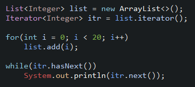 예제처럼 iterator를 앞단에 선언하더라도 루프로 데이터를 읽어오기 전에 iterator를 호출하여 사용하는 것이 가장 확실할 것이다. 또한 당연하게도 반복 중 컬렉션에서 제공하는 자료구조에 변화를 일으키는 메서드를 호출해서는 안된다.