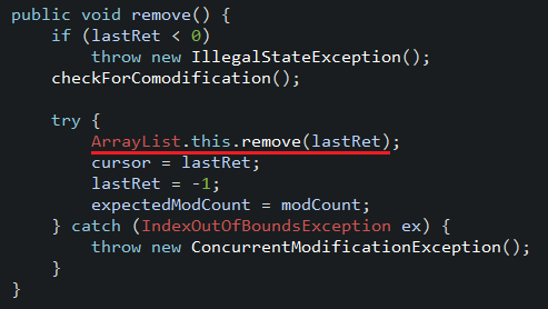remove() 메서드는 이름에서 유추할 수 있듯이 컬렉션 내의 특정 요소를 삭제하는 역할을 한다. 다만 파라미터가 없기 때문에 호출할 때 객체나 인덱스를 넘겨 특정 위치를 지우는 것이 불가능하고 마지막에 next()로 반환된 위치에 있는 데이터를 삭제하는 역할을 한다. lastRet이 현재 위치를 가리키고 있기 때문에 내부에서 remove(int index) 메서드를 호출, 파라미터로 lastRet을 전달하는 것으로 마지막으로 반환된 위치의 데이터를 삭제한다.