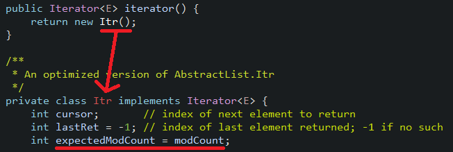 이렇게 초기화 된 expectedModCount는 Itr class 내에서 다음과 같이 사용된다.
