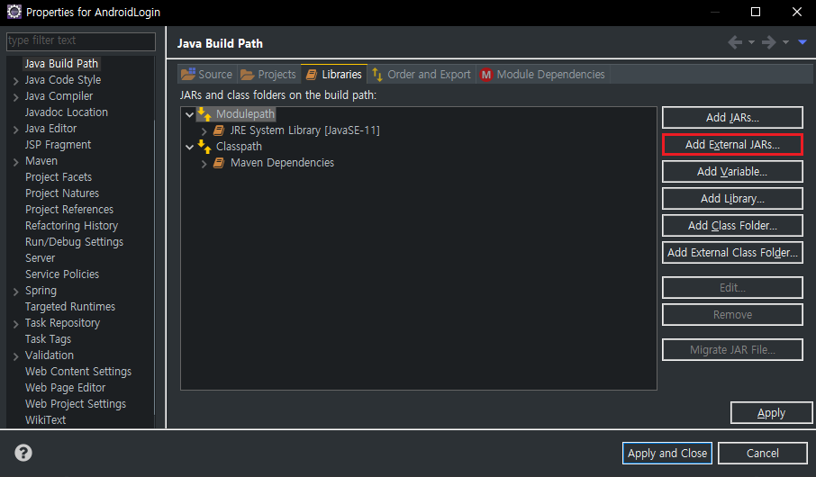 ojdbc를 다운받았다면 이클립스로 돌아와 프로젝트를 우클릭 하여 [Build path → Configure Build Path...]로 들어간다. 위와 같은 화면이 나오면 상단 탭이 "Libraries"인 것을 확인하고 Modulepath를 클릭, 우측의 "Add External JARs..."를 선택해 방금 다운로드한 ojdbc8.jar을 추가한다. 라이브러리 목록에 ojdbc가 추가되었다면 하단의 Apply를 눌러 저장해준다.