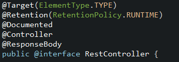 RestController : 클래스 레벨에서 사용하는 어노테이션으로 @Controller와 @ResponseBody 어노테이션을 같이 사용한 것과 같다. 이 어노테이션이 사용되면 클래스 내 모든 메서드에 @ResponseBody 어노테이션이 적용된다.