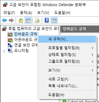 인바운드 규칙에서 우클릭하여 [새 규칙] 선택.