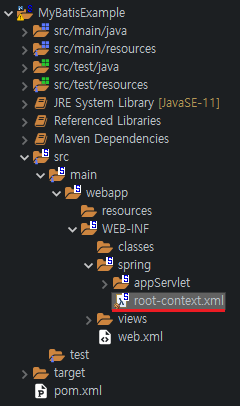 "src/main/resources"에 생성한 마이바티스 설정 파일, 매퍼 파일들을 sqlSessionFactory에 세팅한다. root-context.xml로 돌아와서 sqlSessionFactory에 "configLocation", "mapperLocations" 프로퍼티를 추가하고 파일의 경로를 지정한다.