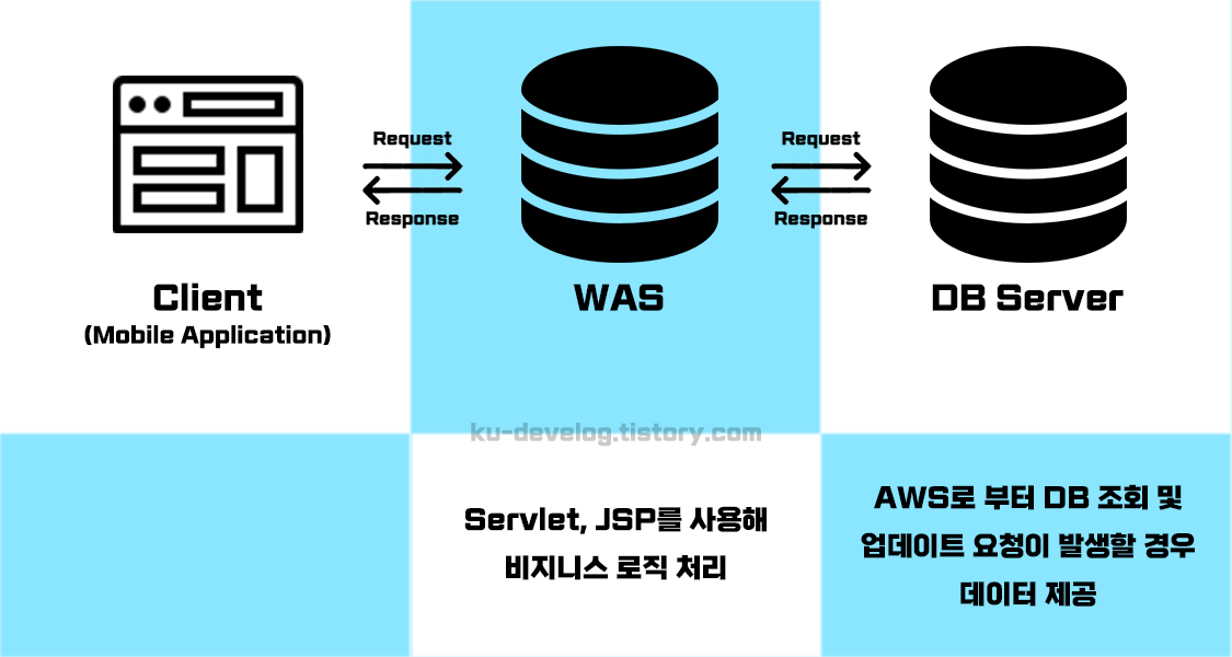 [Client ↔ WAS↔ DB Server]로 나누어 3계층으로 보는 구조로, Web Server가 별도로 존재하지 않고 WAS 가 Web Server의 역할을 같이 한다는 것이 특징이다. 웹 사이트에 접속할 때에는 URL을 통해 해당 사이트에 대한 html을 요청하고 다운받은 html을 브라우저에 표시하는 것인데 일반적인 모바일 어플리케이션의 경우 GUI가 이미 구성되어 있고 UI에 표시할 데이터만 요청한다. 이러한 경우 Web Server가 생략될 수 있고 3-tier에 클라이언트를 포함시킨 위와 같은 구성이 쓰인다고 볼 수 있다.