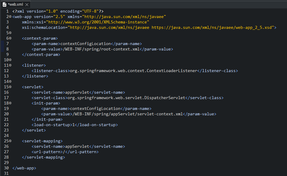[25~28] : 앞서 [15~23]에서 등록한 Dispatcher Servlet에 대한 URL을 매핑한다. <servlet-mapping>은 web.xml에 등록한 서블릿 이름과 클라이언트로부터 받는 url을 매핑할 수 있다.