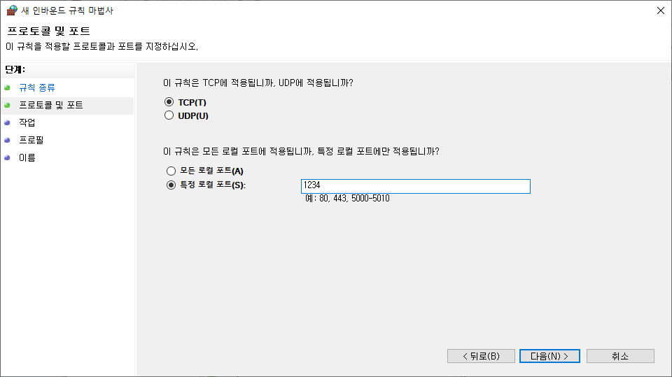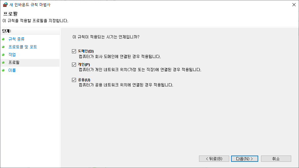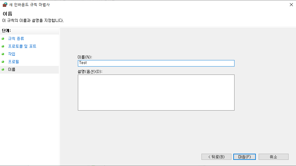 규칙을 식별하기 위해서 인바운드 규칙의 이름을 지정한다. 설명은 굳이 적지 않아도 되지만 코드의 주석처럼 나중에 이 규칙을 왜 생성했는지 혹은 규칙에 대한 정보를 기록하는 용도로 사용할 수 있다.