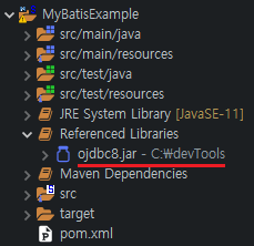 프로젝트로 돌아와보면 Referenced Libraries가 추가된 것을 볼 수 있고 펼쳐보면 안에 "ojdbc8.jar"이 있는 것을 확인할 수 있다.