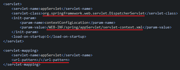 <init-param> 태그는 서블릿 초기화에 사용될 파라미터를 설정한다. 이 경우 디스패처 서블릿이 객체화되고 초기화를 위해 init() 메서드가 호출될 때 참조될 설정 파일의 경로를 파라미터 값으로 설정하며 1개 이상의 파라미터를 설정할 수 있다. <context-param>과 다른 점은 <servlet>내에 선언된 만큼 참조 범위가 해당 서블릿 내로 제한된다.