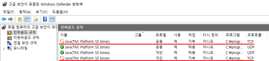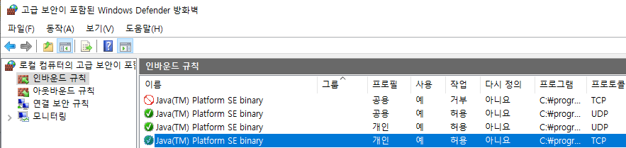 다시 인바운드 규칙으로 돌아온다. 이름 순으로 정렬하여 J로 시작하는 규칙 중에서 "Java(TM) Platform SE binary"를 찾는다. 설정을 따로 건드린 적이 없기 때문에 아마도 기본값이라고 생각되는데 TCP 프로토콜에 해당하는 두 규칙에 차단 아이콘이 표시되어 있는 것을 볼 수 있다. 두 규칙에서 차이는 적용할 프로필 정도로 보이는데 공용과 개인으로 나누어져 있다. 네트워크 환경에 따라 하나 혹은 두 규칙 모두 허용해 줄 것이다. 필자의 경우 소규모 개인 서버이기 때문에 4번 째 개인에 해당하는 규칙을 허용해 줄 것이다.