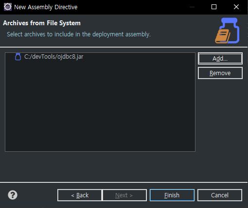 좌측 상단의 검색창에 assembly를 검색하면 나오는 "Deployment Assembly"를 클릭하면 위와 같은 화면으로 진입한다. 우측의 "Add.."를 클릭하고 나오는 창에서 "Archives from File System"을 선택하고 다음을 눌러준다.