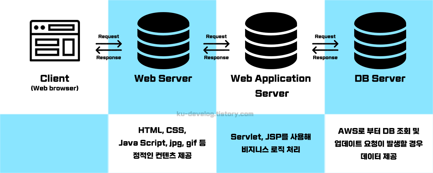[Web Server ↔ WAS ↔ DB Server]로 나누어 3계층으로 보는 구조다. 여기서 클라이언트는 계층에 포함시키지 않고 3 계층으로 보는데 클라이언트를 포함시켜 4-tier라고 부르는 경우도 있다. 일반적으로 웹 페이지가 위와 같이 구성된다.