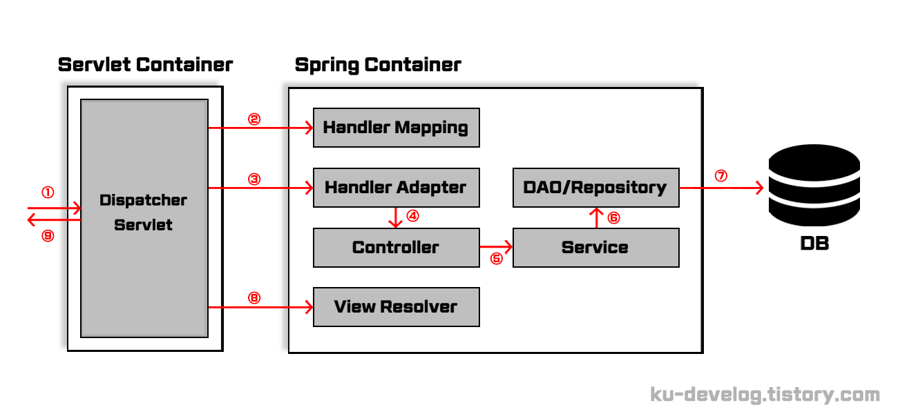 디스패처 서블릿의 요청 처리과정을 이미지로 나타내었다. 기본적으로 존재하는 컴포넌트와 필수 요소만으로 최소 구성하였기 때문에 Filter, Interceptor 등은 없다.