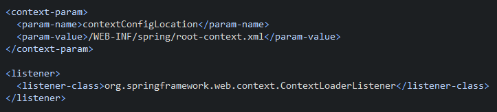 <context-param>은 서블릿 컨텍스트에 파라미터를 등록할 수 있으며 필요에 따라 파라미터를 추가할 수 있다. 자바에서 변수를 선언하듯 param-name으로 이름을 부여하고 값으로 설정 파일(root-context.xml)의 경로를 부여하여 파라미터 이름을 통해 설정 파일에 접근할 수 있게 한다.