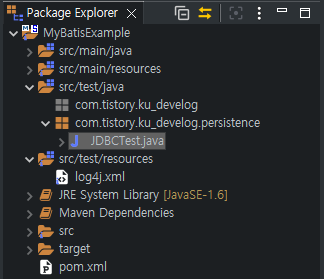스프링 프로젝트에서는 테스트를 위한 디렉터리를 따로 제공하고 있다. "src/test/java"를 열고 테스트를 위한 클래스(JDBCTests.java)를 생성하고 다음 코드를 입력한다.