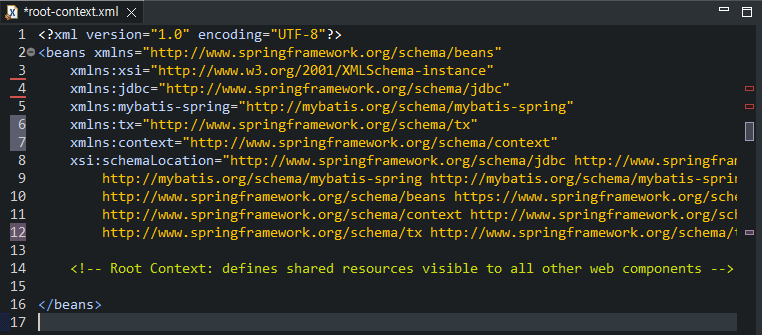 정상적으로 수행됬다면 위와 같이 <beans> 태그가 수정된 것을 확인할 수 있다. 이제부터 bean 객체를 추가한다.