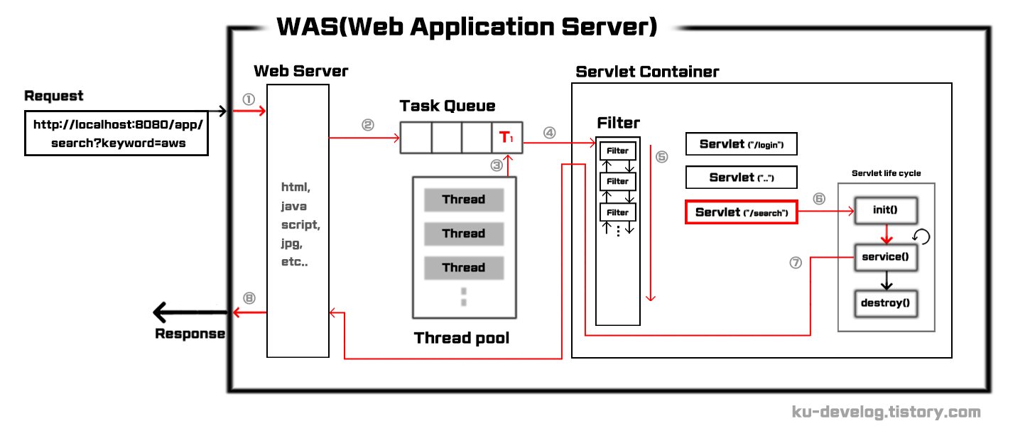 WAS를 Servlet Container로 부르기도 하지만 여기서는 서블릿을 관리하는 서버 사이드의 웹 어플리케이션으로 구분짓는다. 즉, WAS(혹은 톰캣)와 서블릿 컨테이너는 구분된다.