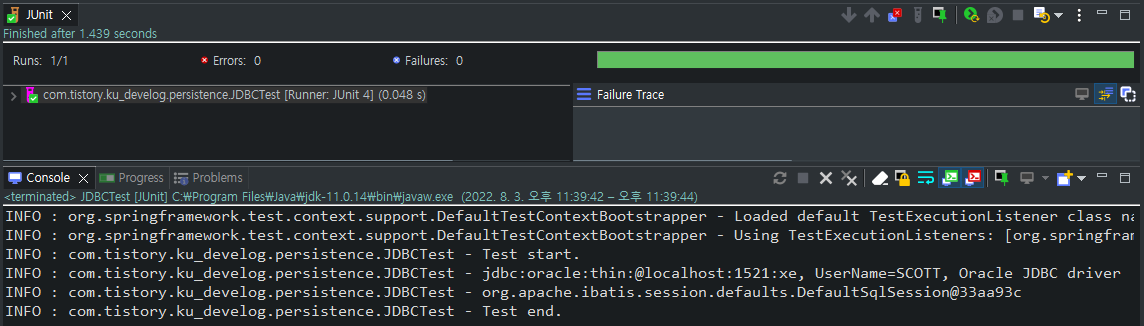 콘솔 탭과 JUnit 탭에 위와 같이 출력되었다면 테스트가 성공한 것이다. 커넥션 풀에서 얻어온 커넥션 객체의 정보와 SqlSessionFactory에서 얻은 SqlSession 정보가 출력된 것을 볼 수 있다.