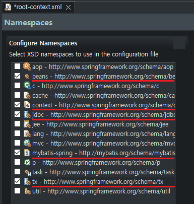 처음 root-context.xml을 열었다면 위와 같이 기본적인 코드만 존재할 것이다. 여기서 하단 탭의 namespace를 누른다.