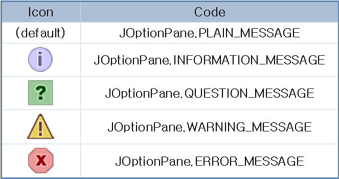 아이콘을 설정했으면 JOptionPane에서 원하는 타입의 다이얼로그(메서드)를 선택한 다음, Icon 객체를 파라미터로 받는 (오버로딩된)메서드를 선택하고 인자로 ImageIcon 객체를 넘겨준다. 그리고 프로그램을 실행하면 아래와 같은 결과를 얻을 수 있다.