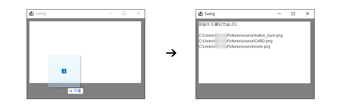 예제는 JTextArea를 배치하여 드롭된 파일 목록을 출력한다. DropTargetListener는 이름에서 짐작할 수 있듯이 파일을 드래그해 올 때 이벤트를 감지하고 처리하는 인터페이스이고, DropTarget은 파일을 드롭시킬 Target Component와 이벤트를 설정할 수 있다. JFrame을 Target으로 하고 이벤트도 현재 클래스에서 implements 했으므로 (this, this)를 넘겨주었다.