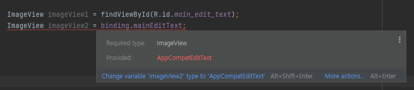 findViewById가 Type Safety하지 못한 이유에 대해서 알아봤다. 그렇다면 바인딩 방식은 findViewById와 무엇이 다르기에 Type Safety한 것인지 보자. 위 코드를 보면 바인딩 객체에서 mainEditText에 접근할 경우 <T extends View>와 같은 타입이 아닌 정확히 AppCompatEditText 객체를 반환해주고 있음을 볼 수 있다. 또 findViewById를 초기화할 땐 코드 문맥상 문제가 없기 때문에 에러를 잡지 못하지만 바인딩 객체는 정확한 타입의 객체를 반환함으로써 초기화려하는 객체의 타입과 반환하려는 객체의 타입이 다르다는 에러 메시지를 출력하고 있음을 볼 수 있다.