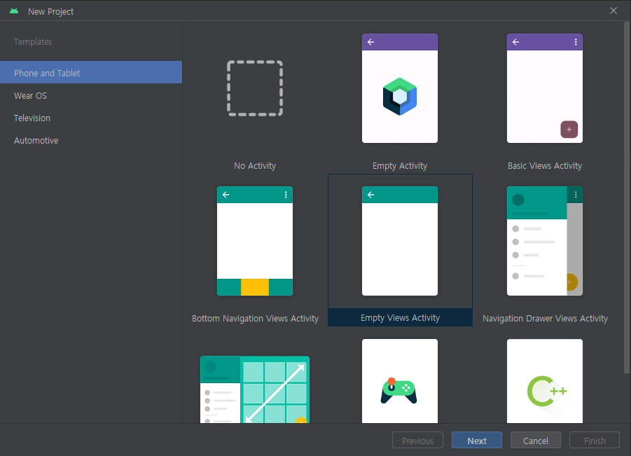 프로젝트를 생성할 때 보면 메뉴에 "Bottom Navigation Views Activity"가 존재하는데 버전이나 언어에 따라 다를 수 있겠지만 나는 이걸로 생성하면 오류가 정말 많이 났다. 처음에 바텀 네비게이션을 구현할 때 이걸로 프로젝트를 만들어 기본 코드를 분석하려 했는데 기본 코드임에도 불구하고 갖은 오류가 발생해 빌드조차 되지 않았었다. 그래서 나는 빈 프로젝트에 바텀 네비게이션을 구현하는 것에 더 익숙하기에 빈 프로젝트로 예제를 시작할 것이다.
