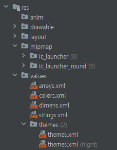 - dimens.xml : 공통적, 자주 사용되는 폰트 사이즈나 View의 widh, height 사이즈 등을 관리 - values/themes : 어플리케이션에서 사용할 테마 리소스를 관리하는 디렉터리