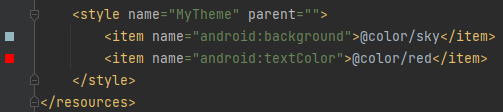 이 파일에는 어플 전체의 테마나 각 View에 대한 커스텀 테마를 생성할 수 있다. 예를 들어 어플의 모든 버튼에 하늘색 배경과 빨간색 폰트를 적용하고 싶다면 적용이 필요한 View를 가진 모든 레이아웃 파일을 수정하고 다녀야 할 것이다.