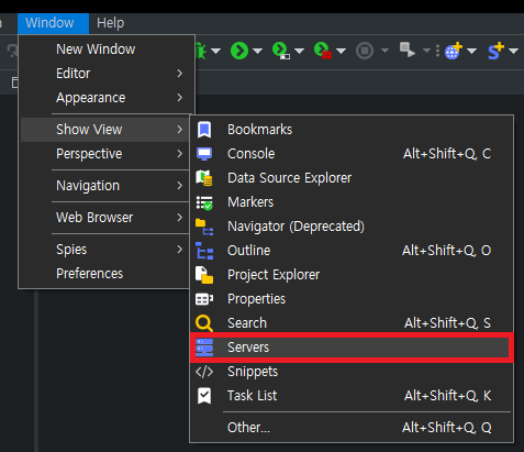 만약 servers 탭이 없다면 [Windows → Show View → Servers]를 눌러 Servers 탭을 활성화시킬 수 있다.