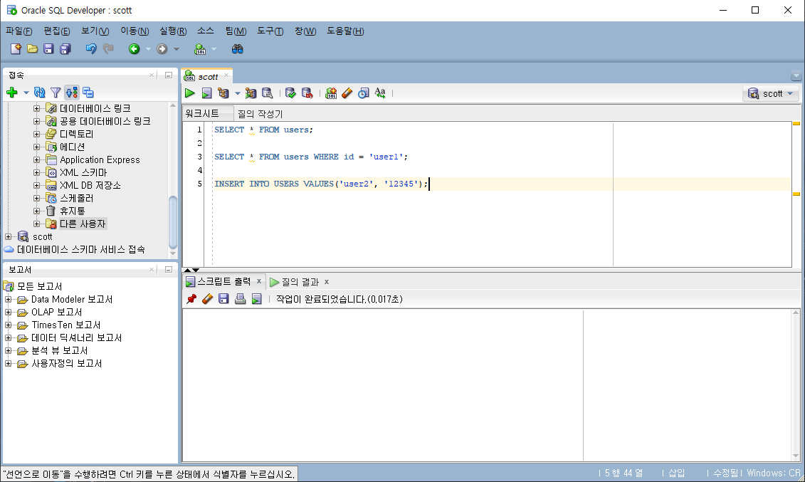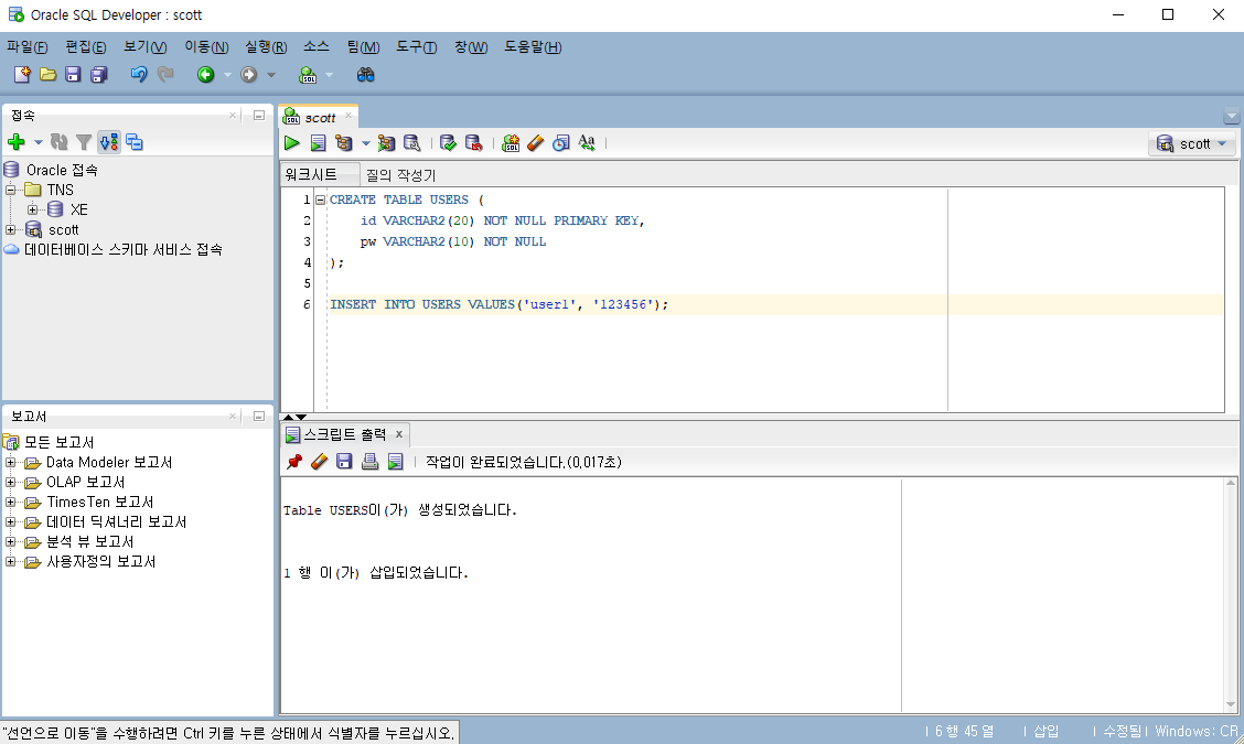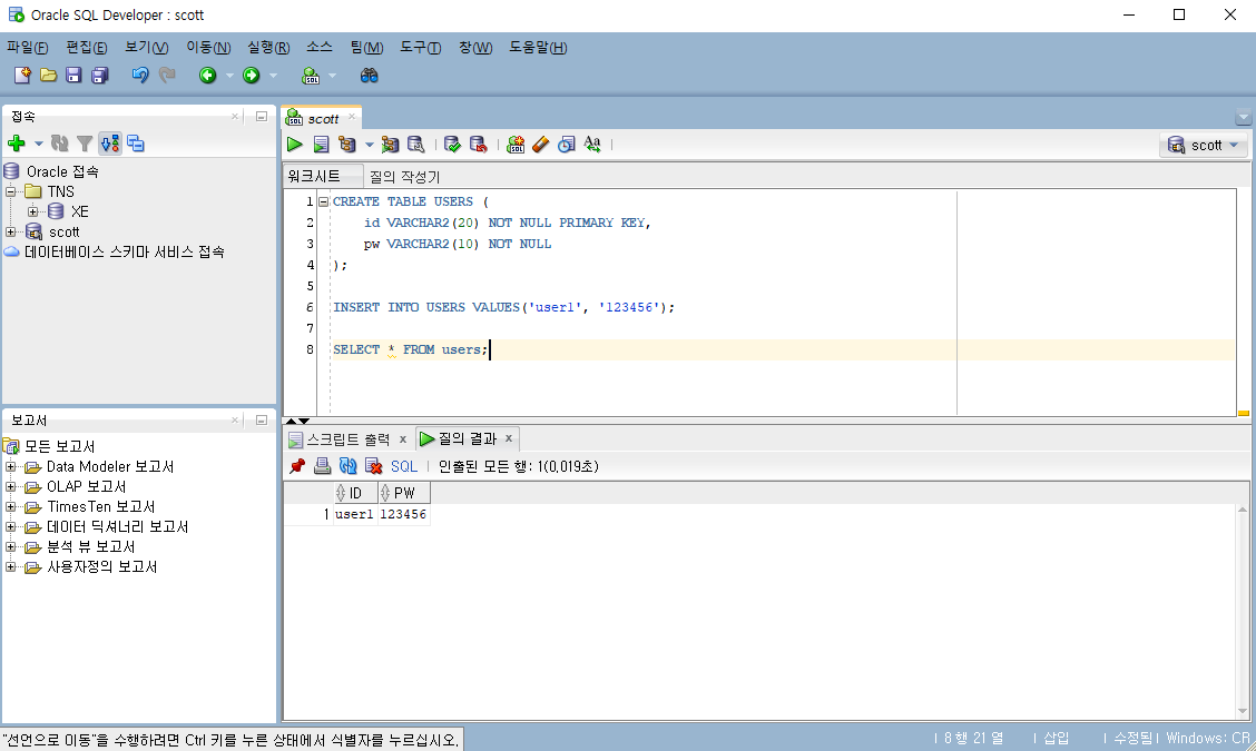 users 테이블에 id가 "user1"이고 pw가 "123456"인 데이터를 추가해보자. 위에서 말했듯 세미콜론만 잘 붙여준다면 이전에 입력한 CREATE문을 지우지 않은 채로 워크시트에 다음 명령문을 적을 수 있다. 단축키를 통해 명령문을 수행하면 스크립트 출력창에 행이 삽입되었다는 메시지를 볼 수 있다.