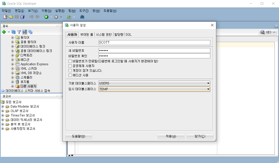 제대로 로그인이 되었다면 XE1이라는 이름으로 워크시트가 하나 켜졌을 것이다. 이대로 사용해도 상관없지만 사용자 계정을 하나 만들어서 사용해보자. 워크시트는 무시하고 좌측 메뉴에서 "다른 사용자"에 우클릭하여 "사용자 생성"을 선택한다.