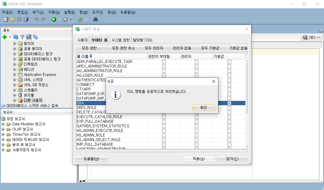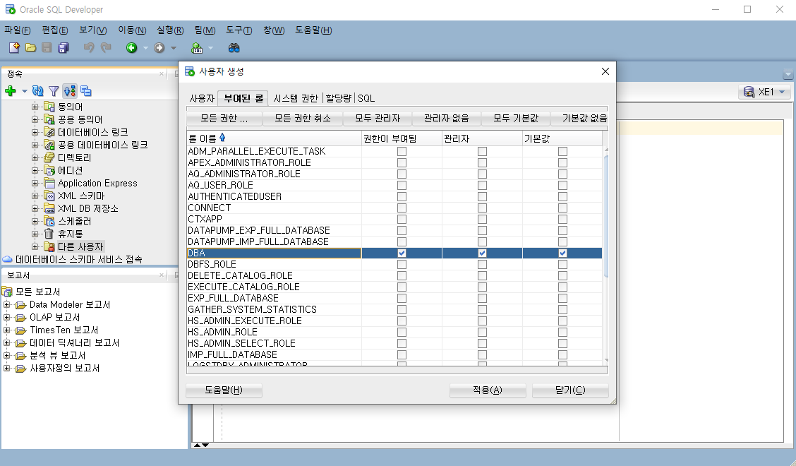 상단 탭에서 [부여된 롤]으로 들어오면 해당 사용자의 권한을 부여할 수 있다. DBA의 권한을 부여한다.