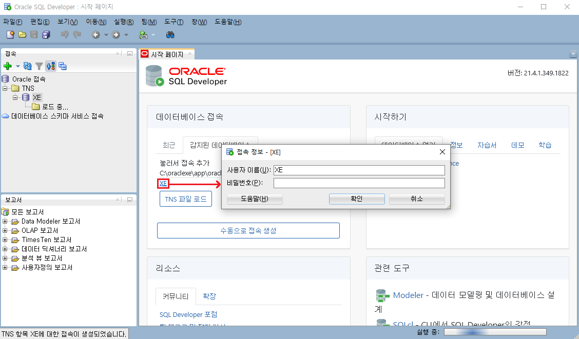 초기 화면에서 "XE"를 클릭하면 위와같은 화면이 나온다. 사용자 이름에는 "system"을, 비밀번호에는 오라클 DBMS를 설치할 때 입력한 비밀번호를 입력해준다.