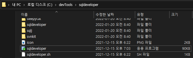 다운로드받은 압축 파일을 해제하면 다음과 같은 파일이 나온다. 여기서 sqldeveloper.exe를 통해 설치를 진행하는데 설치가 완료되어도 시작 메뉴나 바탕화면에 따로 실행 아이콘이 생기지 않기 때문에 이 파일을 통해 sqldeveloper를 실행해야 한다. 때문에 압축을 해제한 파일은 따로 폴더를 만들어 보관하고 sqldeveloper 파일은 바로가기를 만들거나 시작메뉴에 직접 추가해서 사용하는 것을 추천한다.