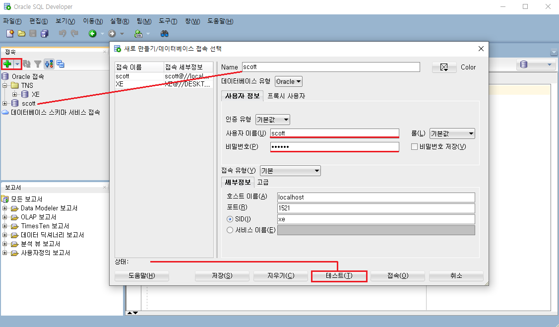 (Name 항목의 용도를 보여주기 위해 미리 생성 후 다시 접속 창을 열었기 때문에 스크린 샷에는 scott이 존재하는 것이고 원래는 없다.)