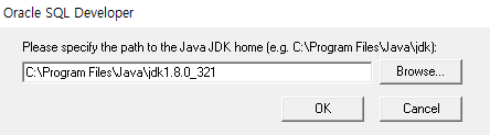 sqldeveloper.exe를 실행시키면 위와 같은 화면을 볼 수 있다. 현재 JDK가 설치된 디렉터리의 경로를 삽입해주면 된다. 현재 환경이 32bit 아키텍쳐라면 "C:\Program Files(x86)\Java"아래에 있을 것이고 64bit 아키텍쳐라면 "C:\Program Files\Java"아래에 있을 것이다. 두 곳 모두 뒤져봤는데 Java 폴더가 없다면 설치되어 있지 않거나 설치할 때 기본 경로를 사용하지 않고 본인이 임의의 경로를 잡아서 다른 곳에 설치되어 있을 확률이 높다. 경로를 입력했다면 OK 버튼을 눌러 설치를 진행한다.