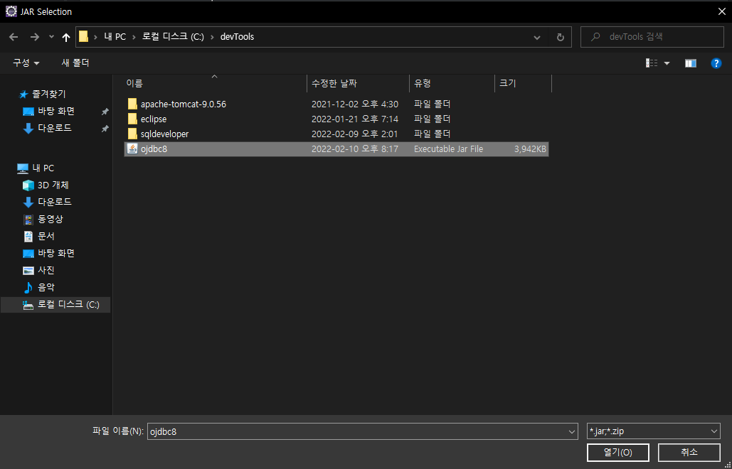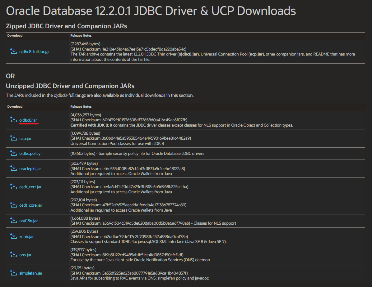 그래도 뭘 받아야할지 모르겠다면 가장 범용성이 높은 OJDBC8.jar을 다운로드한다.