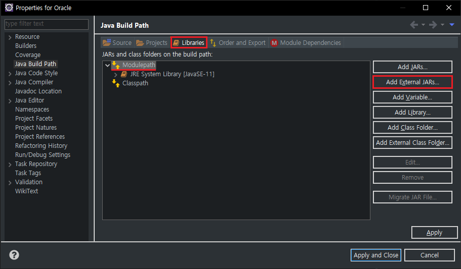 아까 다운받은 "ojdbc*.jar" 파일을 선택하고 돌아온 창에서 "Apply and close를 눌러준다."
