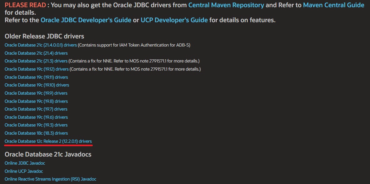 만약 목록에 사용중인 버전이 없을 경우 가장 하단에 있는 "JDBC Downloads page for older releases"를 선택한다. 필자의 버전은 11g인데 구버전 목록에도 없어서 적당히 12c를 선택했다.