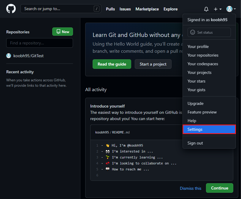 깃 허브에서 상단 우측의 프로필을 클릭하면 출력되는 메뉴에서 Settings를 선택한다.