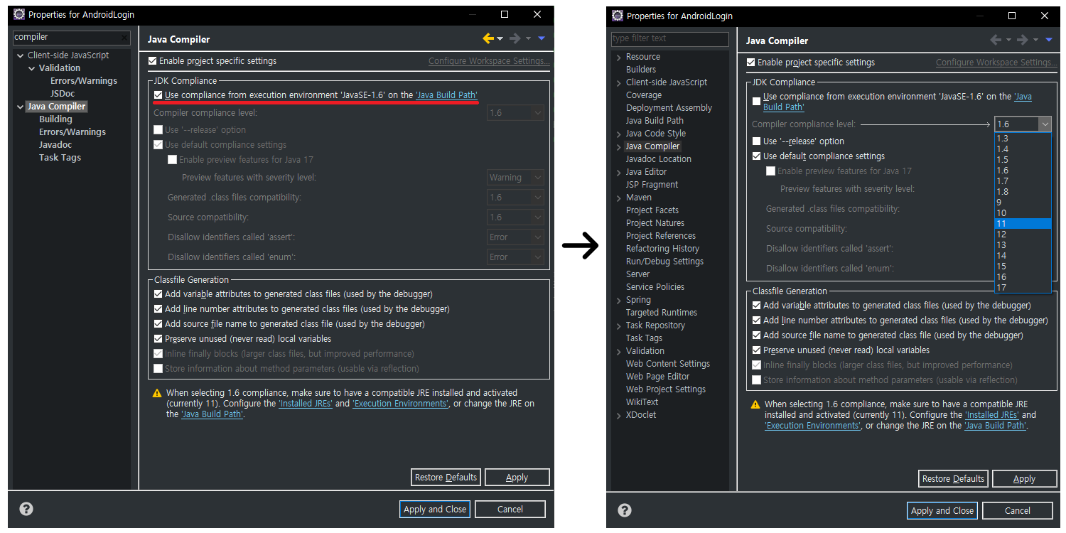 프로젝트를 우클릭하여 Properties를 클릭한다. 좌측 검색창에 "compiler"를 검색하여 "Java Compiler"를 클릭한다. 기본적으로 "Use compliance from execution..."이 체크되어 있는데 이를 체크해제한 후 바로 아래에 Compiler compliance level을 변경해준다. 필자는 자바 11이기 때문에 11로 변경했다. 아래 Apply 버튼을 눌러 변경된 설정을 적용한다.