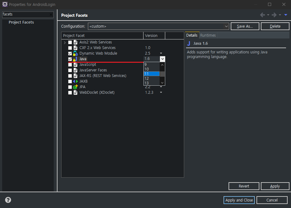 좌측 상단 검색창에 "facets"를 쳐서 "Project Facets"를 클릭한다. 목록에서 "Java"의 버전을 클릭해 11로 맞춰주고 Apply를 눌러 적용시킨 후 창을 종료한다.