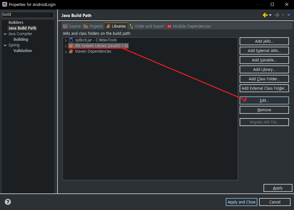 좌측 상단의 검색창에 build를 검색해 Java Build Path로 들어간다. 상단 리본 메뉴가 Libraries인 것을 확인하고 "JRE System.."을 선택하고 우측 메뉴에서 Edit을 클릭한다.