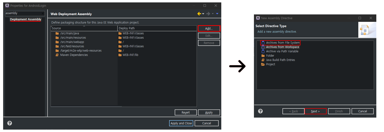 좌측 상단의 검색창에 assembly를 검색하면 나오는 "Deployment Assembly"를 클릭하면 위와 같은 화면으로 진입한다. 우측의 "Add.."를 클릭하고 나오는 창에서 "Archives from File System"을 선택하고 다음을 눌러준다.