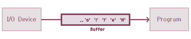 버퍼를 사용하여 "Hello world"를 입력할 때 버퍼를 두게 되면 버퍼에 입력하는 데이터가 쌓이게 된다. 그리고 버퍼가 다 찼거나 사용자가 임의적으로 데이터를 출력하면 버퍼에 있는 데이터가 Program으로 전송된다. 단순히 생각해봐도 버퍼의 크기가 1,024char(2,048byte)일 때 버퍼를 사용하지 않는 경우 1024번 데이터가 전송되는 것을 버퍼를 사용함으로써 1번으로 줄일 수 있다는 것을 알 수 있다.