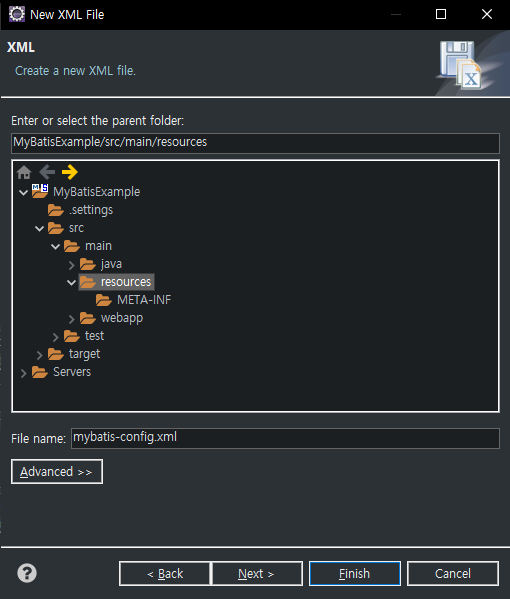 mybatis에 대한 설정 파일을 작성하기 위해 "src/main/resources" 폴더에 우클릭 후 위와 같이 "mybatis-config.xml" 파일을 추가한다. 이름을 바꿔도 되지만 이름을 바꿀 경우 root-context.xml에서 이 파일을 환경설정 파일로 지정할 때 이름도 맞춰서 적어줘야 한다.